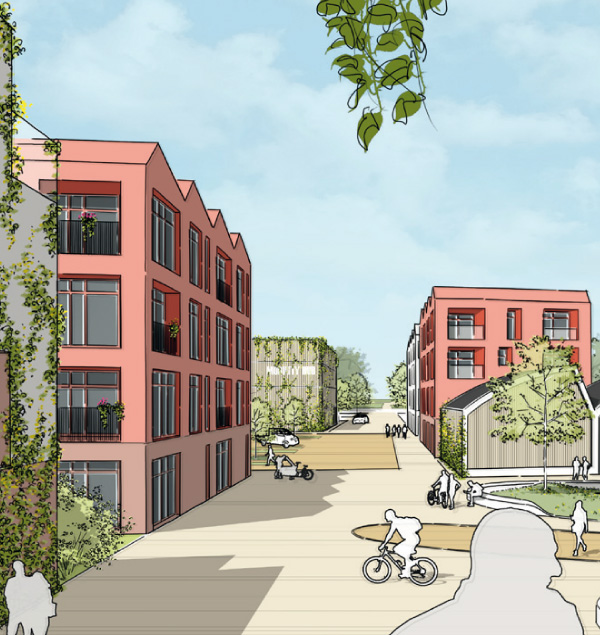 In kleinteiligem Mix aus Einfamilienwohnen in Stadthäusern und Mehrfamilienwohnhäusern sowie moderaten Gebäudehöhen von zwei bis drei Geschossen werden mehrere Wohnhöfe herausgebildet. Zusammengebunden werden diese Höfe durch die bereits erläuterte Durchwegung, die sich an einem Quartiersplatz und an einem Spielplatz aufweitet. Zusammen mit diesem „Anger“ bilden die „Gassen“ zwischen den Wohnhöfen eine nahezu dörfliche Struktur aus.