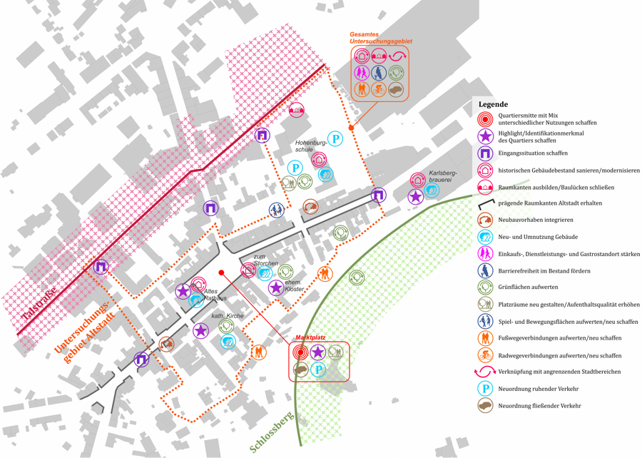 Im Mittelpunkt des Vorhabens steht die Erarbeitung eines integrierten städtebaulichen Entwicklungskonzepts, das durch das Programm „Städtebaulicher Denkmalschutz“ unterstützt wird. Ausgangspunkt war eine detaillierte Analyse des Quartiers rund um den zentralen Marktplatz, bei der die historische Bausubstanz, die kleinteilige Struktur sowie die bestehenden Herausforderungen und Potenziale untersucht wurden. Ziel war es, Leitlinien zu entwickeln, die als Grundlage für konkrete Maßnahmen dienen, um sowohl den baulichen Bestand zu erhalten als auch neue Perspektiven für Wohnen, Handel, Gastronomie und Tourismus zu schaffen.