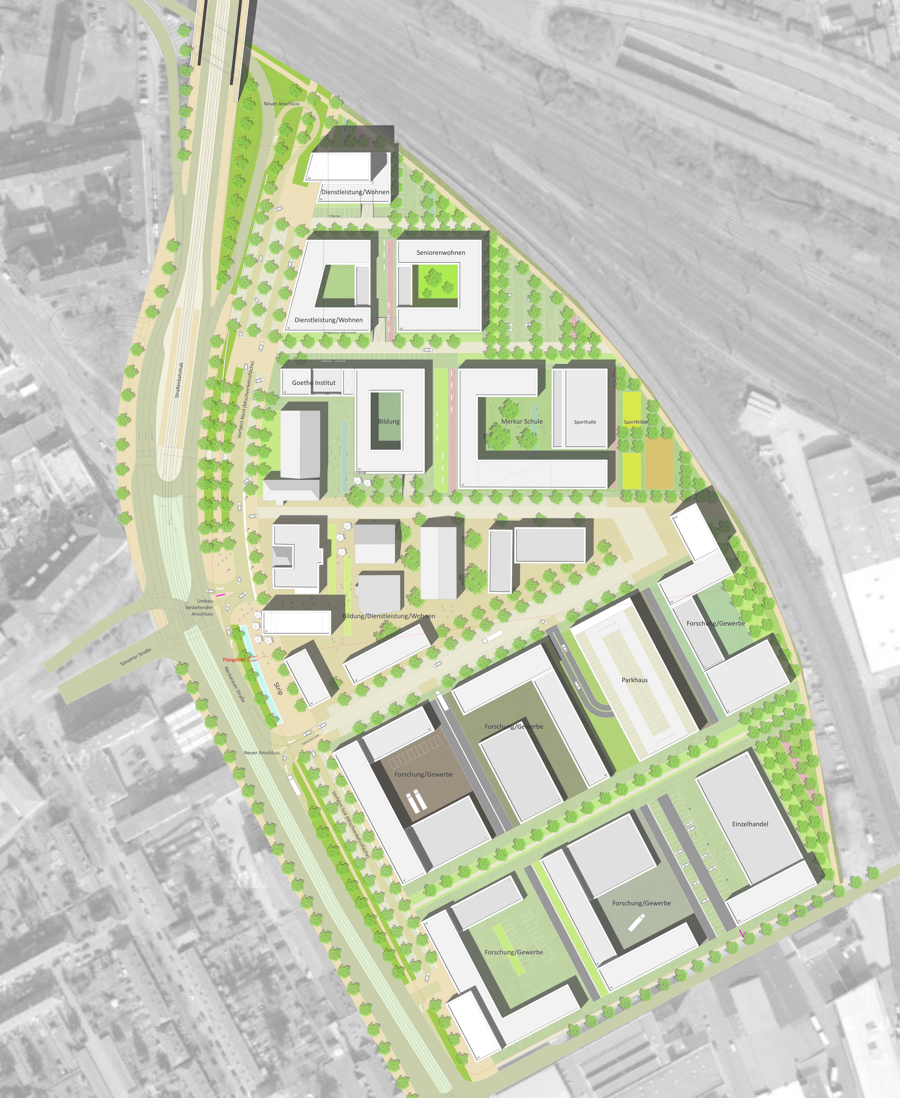 Im Rahmen eines zweiphasigen kooperativen Verfahrens wurde ein integratives Konzept entwickelt, das die verschiedenen Nutzungen in eine nachhaltige und funktionale Ordnung bringt. Das Planungsteam, bestehend aus MESS, urbane gestalt landschaftsarchitekten und SHP Ingenieure, konnte die Jury mit einem ganzheitlichen Ansatz überzeugen. Dabei wurde ein stabiles räumliches und programmatisches Grundgerüst definiert, das sowohl klare Entwicklungsrichtlinien vorgibt als auch genügend Flexibilität für zukünftige Anpassungen bietet.