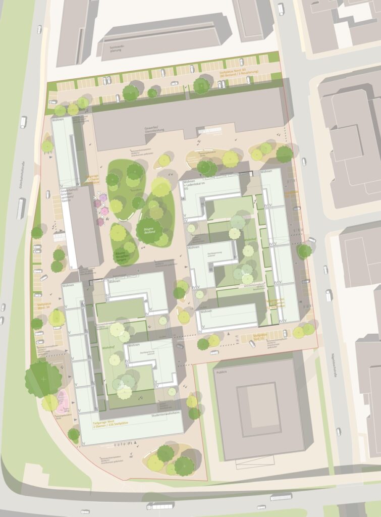 Ein neu gestalteter öffentlicher Platz bildet das Herzstück des Quartiers und integriert bestehende Freiräume unter Berücksichtigung des Baumbestands. Die Mischung aus Wohn- und Gewerbenutzungen sowie die hochwertige Gestaltung der öffentlichen und privaten Freiräume verleihen dem Quartier eine hohe Urbanität und Lebensqualität. So entsteht ein lebendiges Stadtviertel, das funktionale Anforderungen mit ästhetischen und sozialen Qualitäten verbindet.