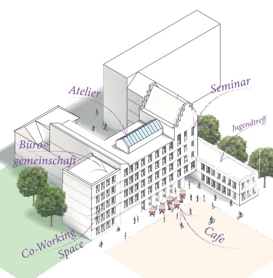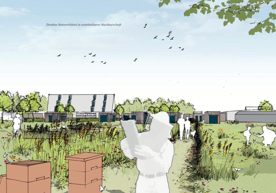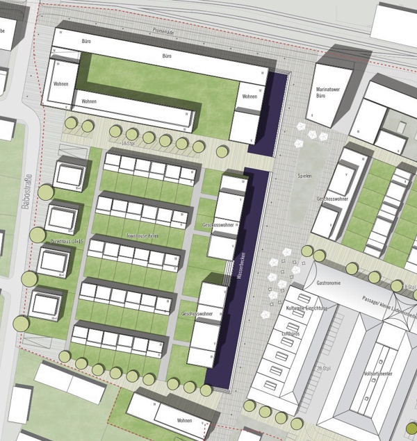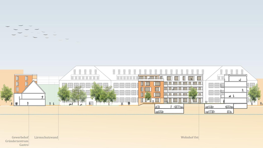 Die gewählte Blockstruktur ermöglicht eine geschützte Innenhofgestaltung, die parkähnliche Freiräume mit privaten Wohnhöfen verbindet. Die Neubebauung wird überwiegend für Wohnzwecke genutzt, wobei ein ausgewogener Wohnungsmix mit altersgerechten Wohnungen, Familienwohnungen und studentischem Wohnen geschaffen wird. Die Gebäude sind so konzipiert, dass flexible Grundrissgestaltungen möglich sind. Lärmschutzmaßnahmen wie Schallschutzfenster und begrünte Lärmschutzwände sorgen für eine hohe Wohnqualität. Gleichzeitig werden bestehende Gewerbenutzungen erhalten und durch einen Anbau ergänzt, der einen Gewerbehof für Existenzgründer sowie eine gastronomische Nutzung im Erdgeschoss beinhaltet.
