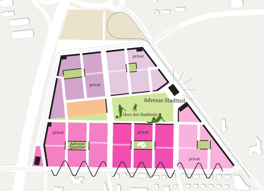 Im Rahmen eines offenen Realisierungswettbewerbs wurde MESS als Preisträger ausgewählt, um in einem weiteren städtebaulichen Wettbewerb die Entwürfe weiter zu entwickeln. Das Verfahren fand unter intensiver Beteiligung der Öffentlichkeit statt. Der Entwurf von MESS schafft ein klares und tragfähiges städtebauliches Gerüst, das durch eine Membranstruktur die Ränder des Quartiers definiert. Diese Randzonen schützen vor äußeren Störungen, wie Lärm, und bieten gleichzeitig Zugang und Vernetzung mit der Umgebung. Das innere Gerüst aus öffentlichen und privaten Freiräumen ermöglicht eine hohe Vielfalt an Nutzungen und fördert urbanes Leben.