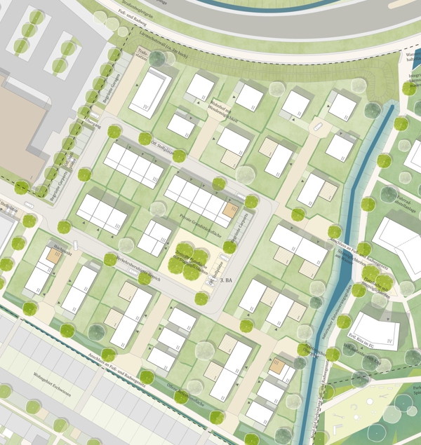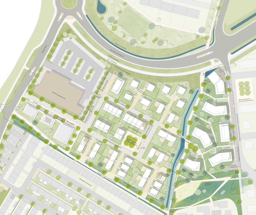 Das durchdachte Konzept erlaubt eine flexible Erweiterung des Quartiers nach Osten, indem ein Erschließungsring angefügt und die Hofstruktur gespiegelt wird. Gleichzeitig sorgen naturnahe Gestaltungselemente wie Versickerungsmulden für nachhaltiges Regenwassermanagement und eine harmonische Einbindung in die Umgebung.