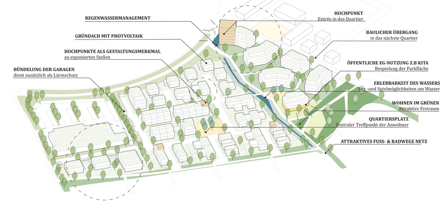 Das Ergebnis ist ein durchdachtes Konzept, das eine Vielzahl von Wohnungsbautypologien und Gewerbeflächen bietet. Die Quartiersstruktur variiert von groben Randbereichen bis hin zu feineren inneren Zonen. Privater Wohnungsbau, wie auf Townhouseparzellen oder durch Bauherrengemeinschaften, wird ebenfalls ermöglicht. Das Mobilitätskonzept fördert nachhaltige Angebote und minimiert den motorisierten Individualverkehr, während eine hohe Aufenthaltsqualität durch sorgfältig gestaltete Grünflächen und Straßenräume geschaffen wird.