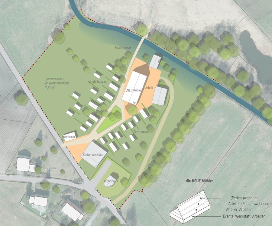 Das Ergebnis der Planung ist die Vision eines „Öko-Dorfes“ – ein autarkes, nachhaltiges Modellquartier, das moderne Wohnformen, Arbeitsmöglichkeiten und eine zukunftsorientierte Energie- und Mobilitätsinfrastruktur vereint. Die Neumühle wird somit zu einem Vorreiter für nachhaltiges Leben und Arbeiten im ländlichen Raum, das auf innovative Weise Energie spart und produziert.