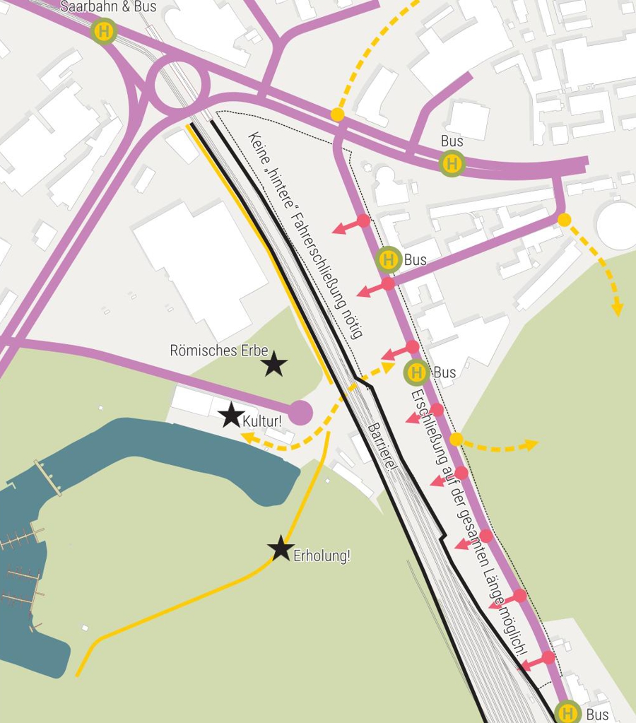 Ziel ist eine sozial durchmischte Bewohnerschaft, wobei Nachhaltigkeit ein zentrales Element des Entwurfs darstellen soll. Aspekte wie Ökologie, Klimaschutz und umweltfreundliche Mobilität müssen mitgedacht werden. Die Topografie des Gebiets stellt eine Herausforderung für die Erschließung dar, da die Anbindung an die Landstraße und die Nähe zur Bahntrasse die Planung erschweren. Die Erschließung wird voraussichtlich über die Saarbrücker Gemarkung erfolgen, was eine interkommunale Zusammenarbeit bei der Flächenentwicklung erfordert. Das Strukturkonzept soll eine erste Vorstellung von der Bebauung vermitteln und den Eigentümern Entwicklungsmöglichkeiten aufzeigen.