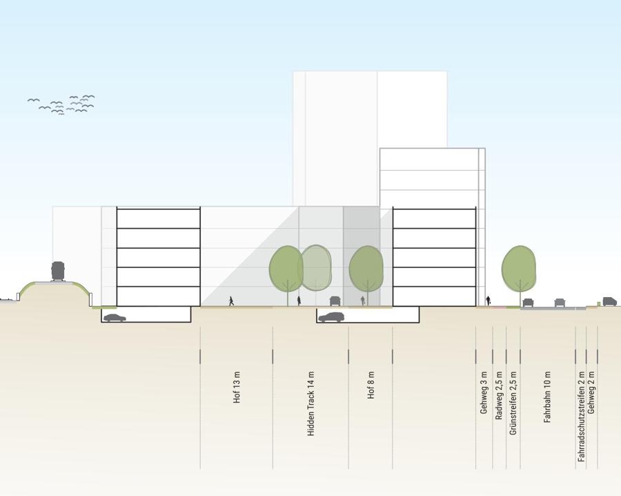 Der Entwurf geht von einer Entkopplung von Wohnen und Parken aus, um Platz für eine hohe Typologienvielfalt und einen niedrigen Flächenverbrauch zu schaffen. Das Parken wird in einem flexiblen, effizienten Parkhaus organisiert, das auf den Bedarf einer zukünftigen, weniger auf den PKW fokussierten Mobilität abgestimmt ist. Ergänzt wird das Konzept durch autonome Rufbusse, die die Quartiere miteinander verbinden und so eine komfortable und zukunftsorientierte Mobilität ermöglichen.