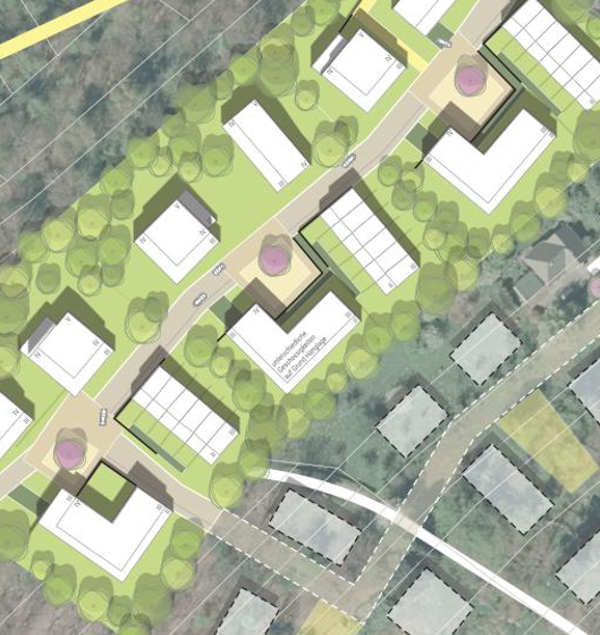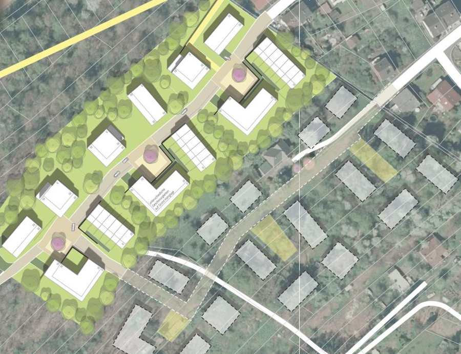 In einem mehrstufigen Prozess wurde die bestehende Siedlungsstruktur analysiert, um mögliche Entwicklungsszenarien zu erarbeiten. Dabei wurden städtebauliche Elemente wie die kleinteilige Haus-Hof-Bebauung und grüne Innenbereiche berücksichtigt. Der Neubau eines Lidl-Marktes wurde als isolierter Fremdkörper erkannt und es wurde ein Entwurf entwickelt, der die Siedlungskante unter Beibehaltung eines grünen Innenbereichs fortführt. Gleichzeitig wurde die Notwendigkeit einer Anpassung an heutige Nutzungsansprüche berücksichtigt, was den Einsatz von Geschosswohnungsbau erforderte.