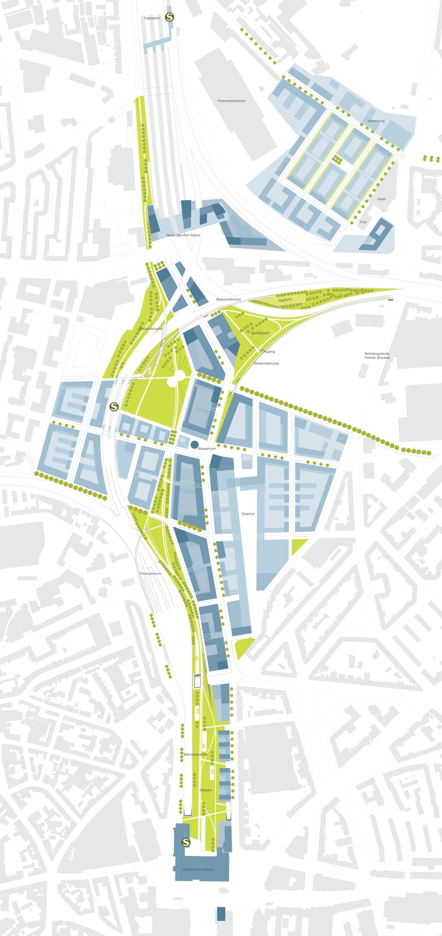 Das neue Viertel wird als eigenständige Einheit mit drei klar definierten Quartieren rund um einen zentralen Park konzipiert. Diese prägnante städtebauliche Struktur erlaubt eine flexible, etappenweise Realisierung, abhängig von der Verfügbarkeit der Grundstücke. Ein besonderer Fokus liegt auf der Verbesserung des Freiraumsystems: Neben neuen Freizeit- und Erholungsflächen entstehen durchgängige Wegeverbindungen in Ost-West- und Nord-Südrichtung. Der zentrale Grünzug schließt die bestehende Lücke im städtischen Freiraumsystem und erweitert die bedeutende städtebauliche Achse vom Altonaer Balkon über den alten Bahnhof Altona bis zum neuen Fernbahnhof Diebsteich. Die denkmalgeschützten Güterabfertigungshallen werden dabei in das Quartierskonzept integriert und neu genutzt.