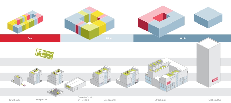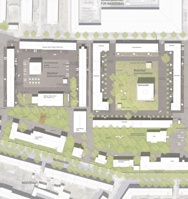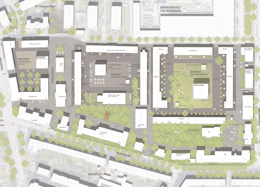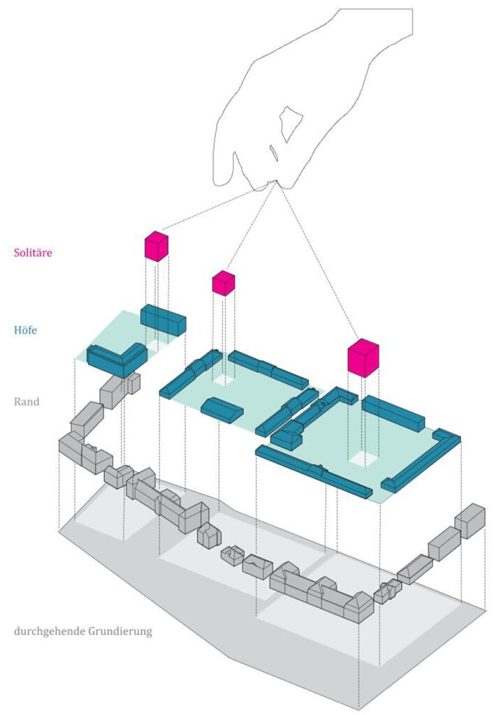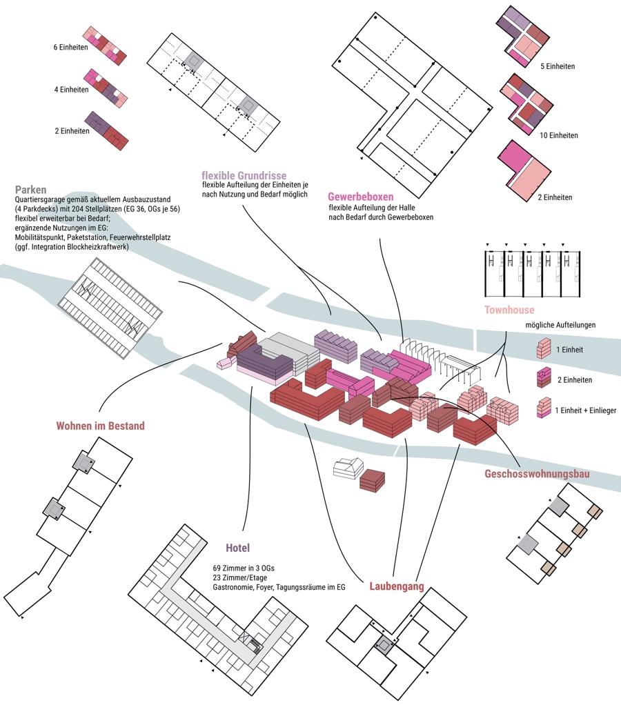 Die Konzeption basiert auf einem stabilen räumlichen Grundgerüst, das die Randbebauung und die Hofstruktur bewahrt, sowie einer flexiblen Typologie von Solitärbauten, die schrittweise entwickelt werden können. Die historische Struktur wird wieder ablesbar gemacht, indem nicht denkmalgeschützte, nachträglich errichtete Gebäude entfernt werden. Erhaltenswerte Bestandsgebäude werden schrittweise für künftige Nutzungen aufbereitet. Die drei Haupthöfe erhalten spezifische Nutzungsmischungen: Der WohnHof integriert Wohnangebote und büronahe Nutzungen, der WerkHof kombiniert Gewerbe, Handwerk und Dienstleistungen, während der OfficeHof Verwaltungs- und Bildungsnutzungen beheimaten kann.