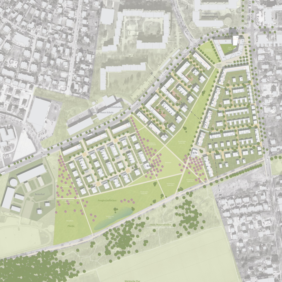Unser prämierter Entwurf sieht eine strukturierte Quartiersentwicklung mit einer zentralen Freiraumachse vor, die die Landschaft mit dem Stadtraum verbindet. Drei große Baufelder sowie ein kleinerer Stadtblock gruppieren sich um diese Achse und interpretieren die bestehende Bebauungsstruktur auf moderne Weise. Die Quartiere sind thematisch untergliedert in „Stadtrandquartier“, „Stadtquartier“, „Stadteingang“ und „Stadtland“. Sie sind so konzipiert, dass sie unabhängig voneinander entwickelt werden können und flexibel an die Marktnachfrage angepasst werden. Das Freiraumsystem integriert Ausgleichsflächen, Spiel- und Sportbereiche sowie eine Anbindung an bestehende Nachbarschaften.