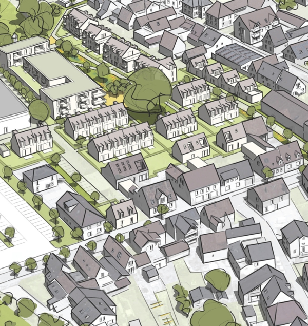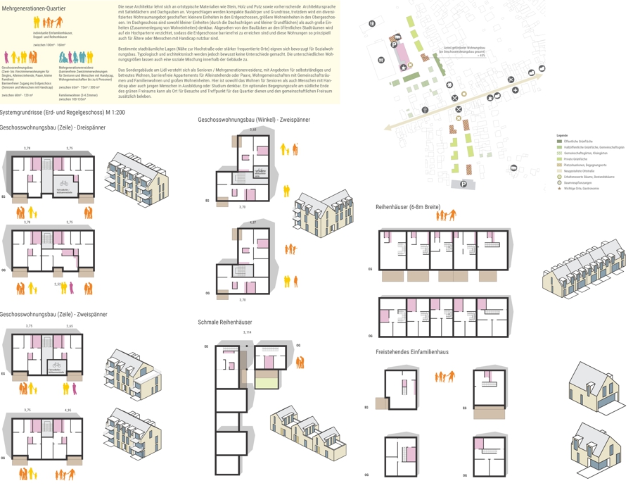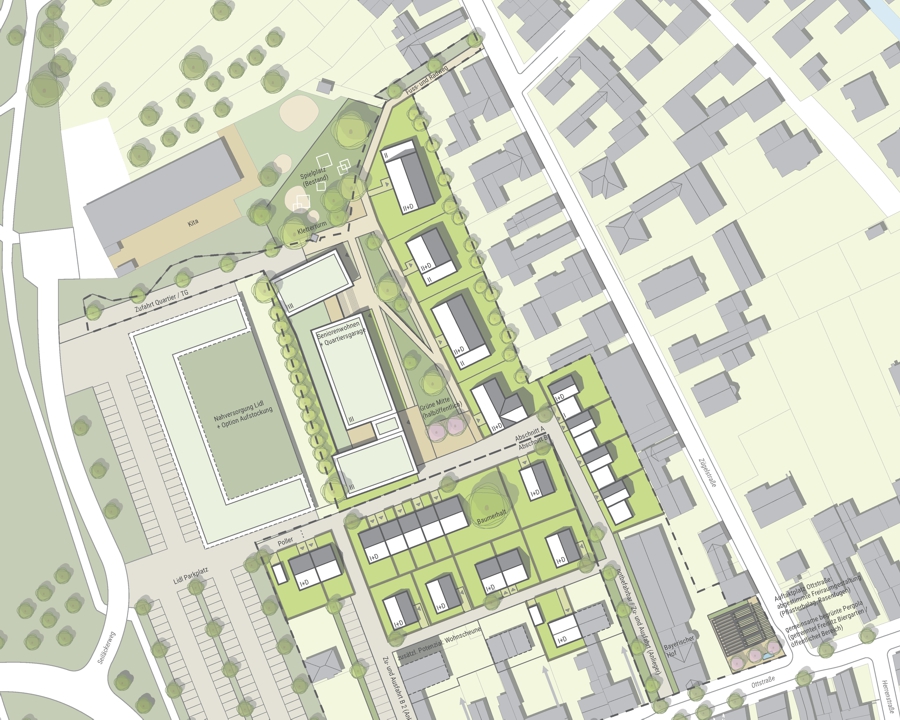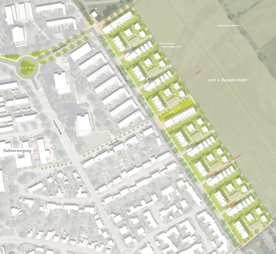 In einem mehrstufigen Prozess wurde die bestehende Siedlungsstruktur analysiert, um mögliche Entwicklungsszenarien zu erarbeiten. Dabei wurden städtebauliche Elemente wie die kleinteilige Haus-Hof-Bebauung und grüne Innenbereiche berücksichtigt. Der Neubau eines Lidl-Marktes wurde als isolierter Fremdkörper erkannt und es wurde ein Entwurf entwickelt, der die Siedlungskante unter Beibehaltung eines grünen Innenbereichs fortführt. Gleichzeitig wurde die Notwendigkeit einer Anpassung an heutige Nutzungsansprüche berücksichtigt, was den Einsatz von Geschosswohnungsbau erforderte.