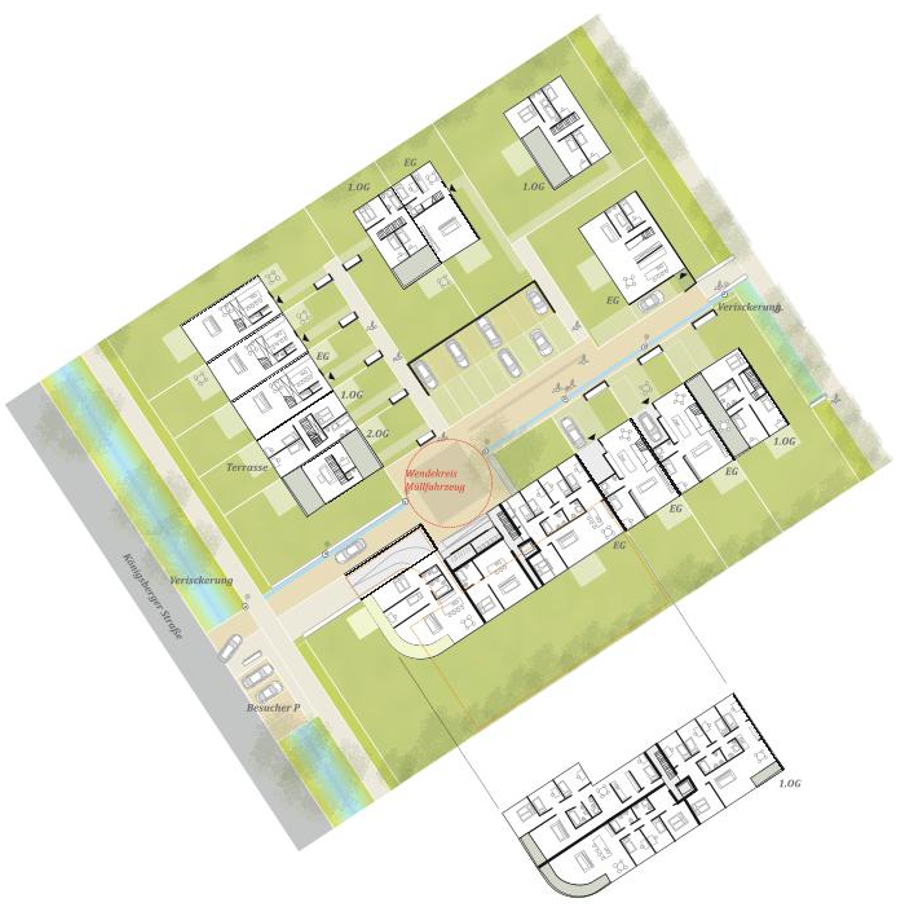 Die städtebauliche Konzeption basiert auf sieben homogenen Nachbarschaften, die sich um Wohnhöfe gruppieren. Die Königsberger Straße dient als Haupterschließung, während ein neuer Fuß- und Radweg den Siedlungsrand begleitet. Bestehende Wegeachsen werden konsequent aufgegriffen und mit dem Quartier verknüpft. Die Wohnhöfe sind als Mischverkehrsflächen gestaltet, die allen Verkehrsteilnehmern gleichrangige Nutzung ermöglichen. Stellplätze und Tiefgaragenzufahrten sind an den Rändern angeordnet, wodurch die Innenhöfe weitgehend vom Verkehr entlastet werden.