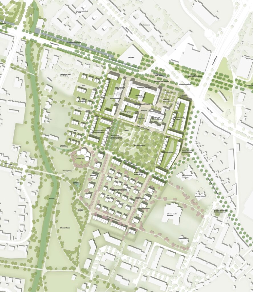 Das Konzept setzt auf eine solide städtebauliche Struktur mit Quartieren, die jeweils einen eigenen Charakter entwickeln. Im Bereich des Klosters entstehen die Klostergartenhöfe mit verdichtetem Wohnraum und einem zentralen Park. Südlich und westlich schließen sich die Auen- und Obsthöfe an, die sich mit aufgelockerter Bebauung harmonisch in die umgebenden Freiräume einfügen. Durch die Aufnahme bestehender Strukturen und Richtungen aus der Umgebung wird das Quartier in die Stadt integriert, mit durchgrünten Traversen als verbindende Elemente.