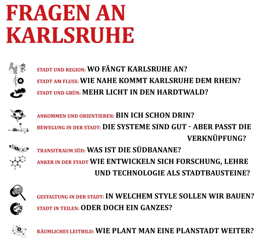 Die Vorgehensweise basiert auf einer ganzheitlichen Betrachtung der Stadt, die über einzelne Projekte hinausgeht und ein gemeinsames Bild für die zukünftige Entwicklung entwirft. Wichtige Themenfelder umfassen das Verhältnis der Stadt zur Region und zum Rhein, den Hochschul- und Technologiestandort, Mobilität, Stadtbild und Freiräume. Die bauliche Struktur und das Erscheinungsbild Karlsruhes sollen unter Berücksichtigung dieser Aspekte weitergedacht werden. Dabei geht es um Fragen zur Wohn- und Gewerbegebietsentwicklung, zur Nutzung bestehender Flächenpotenziale und zur Gestaltung naturräumlicher Übergänge.