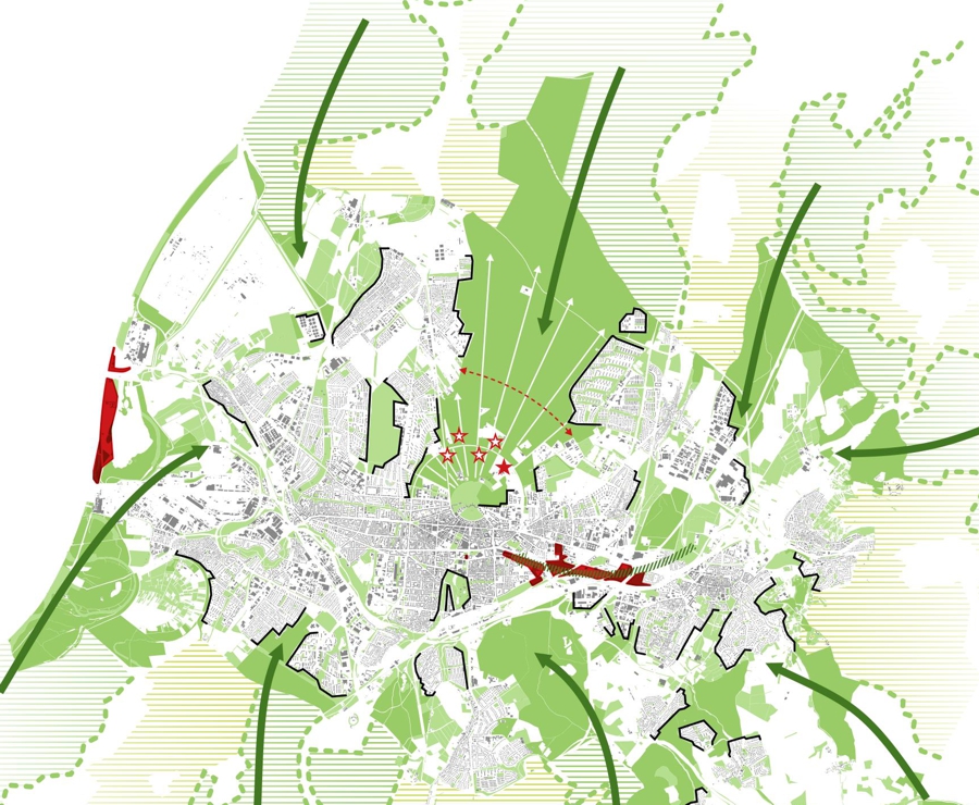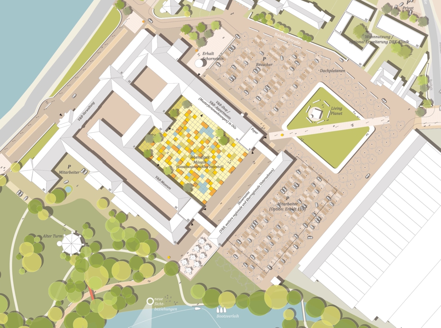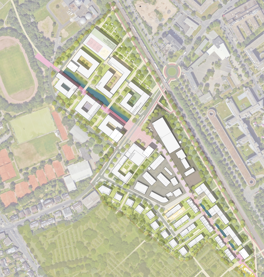 Im Rahmen eines zweiphasigen kooperativen Verfahrens wurde ein integratives Konzept entwickelt, das die verschiedenen Nutzungen in eine nachhaltige und funktionale Ordnung bringt. Das Planungsteam, bestehend aus MESS, urbane gestalt landschaftsarchitekten und SHP Ingenieure, konnte die Jury mit einem ganzheitlichen Ansatz überzeugen. Dabei wurde ein stabiles räumliches und programmatisches Grundgerüst definiert, das sowohl klare Entwicklungsrichtlinien vorgibt als auch genügend Flexibilität für zukünftige Anpassungen bietet.