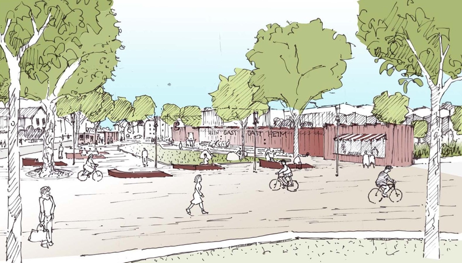 Der Wenderplatz, bislang ein unscheinbarer Parkplatz, wird zu einem urbanen Ort transformiert, der zukünftig als Bindeglied zwischen der Innenstadt, dem Rennbahngelände und perspektivisch auch dem Rhein dient. Ziel des Projekts ist es, diesen Raum von einem Transitbereich zu einem eigenständigen, attraktiven Stadtbaustein zu entwickeln, der hochfrequentierte Nutzungen beherbergt und eine hohe Aufenthaltsqualität bietet. Das geplante Forum wird zum neuen Zentrum des Stadtteils und soll sowohl als Verbindungselement als auch als Treffpunkt fungieren.