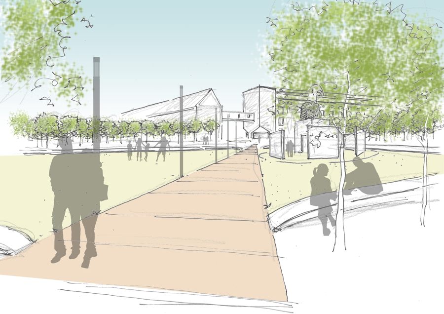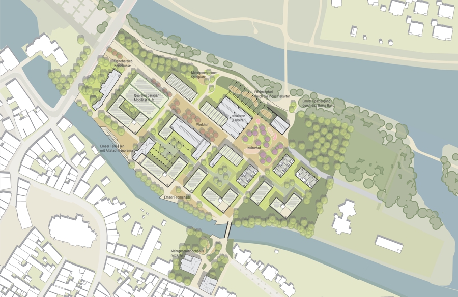 Im Zuge der Neuentwicklung des Areals kommt insbesondere dem Umgang mit dem Bestand und der Ablesbarkeit des industriellen Erbes große Bedeutung zu. Dies umfasst zum einen den Erhalt prägender und wertvoller Bauten sowie deren Um- und Neunutzung. Zum anderen auch den Erhalt der räumlichen Grundkonfiguration des Areals und seiner „Richtungen“. Im Rahmen der Ausbildung von Baufeldern steht auch die Auseinandersetzung mit dem öffentlichen Raum, mit der Schaffung qualitätvoller Freiräume und Platzflächen sowie attraktiv gestalteter Uferzonen im Fokus. Die Einbindung des neuen Quartiers in seine naturräumliche Umgebung sowie die enge Vernetzung von Frei- und Siedlungsräumen sind zentrale Aufgaben. Ebenso die Integration zu erhaltenden Bestands in die neue Bau- und Nutzungsstruktur.