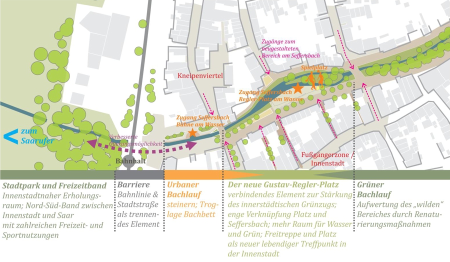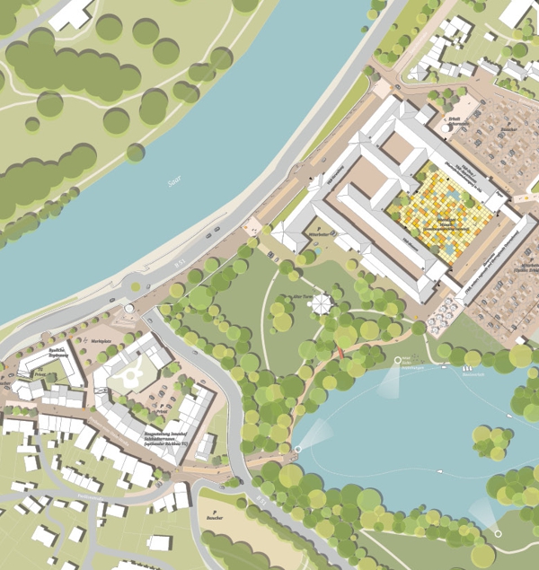 Das Konzept basiert auf einer intensiven Analyse der städtebaulichen Rahmenbedingungen und der durch den Strukturwandel entstandenen Defizite. Im Fokus steht die Frage, wie sich Mettlach gestalterisch und funktional weiterentwickeln kann. Durch die neuen Entwicklungsmöglichkeiten entstehen Chancen, die zentrale Mitte des Ortes besser mit ihrer Umgebung zu vernetzen. Besondere Orte wie Schloss Saareck, die City, der Abteipark, die Alte Abtei und das Saarufer werden gezielt miteinander verbunden und stärken so die Attraktivität Mettlachs sowohl für Bewohner als auch für Besucher.
