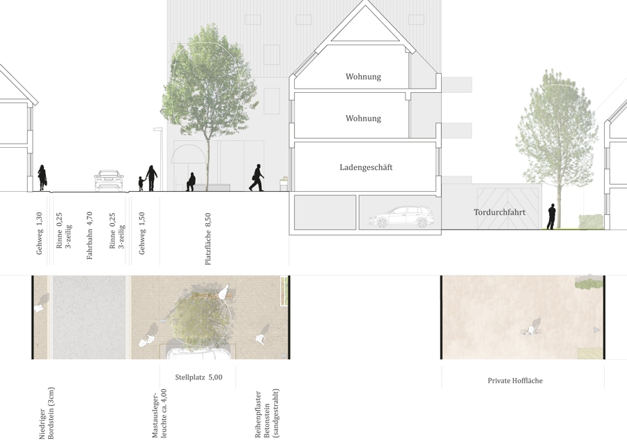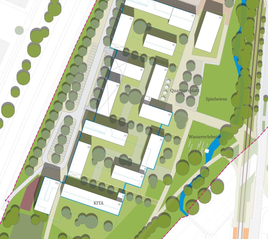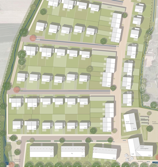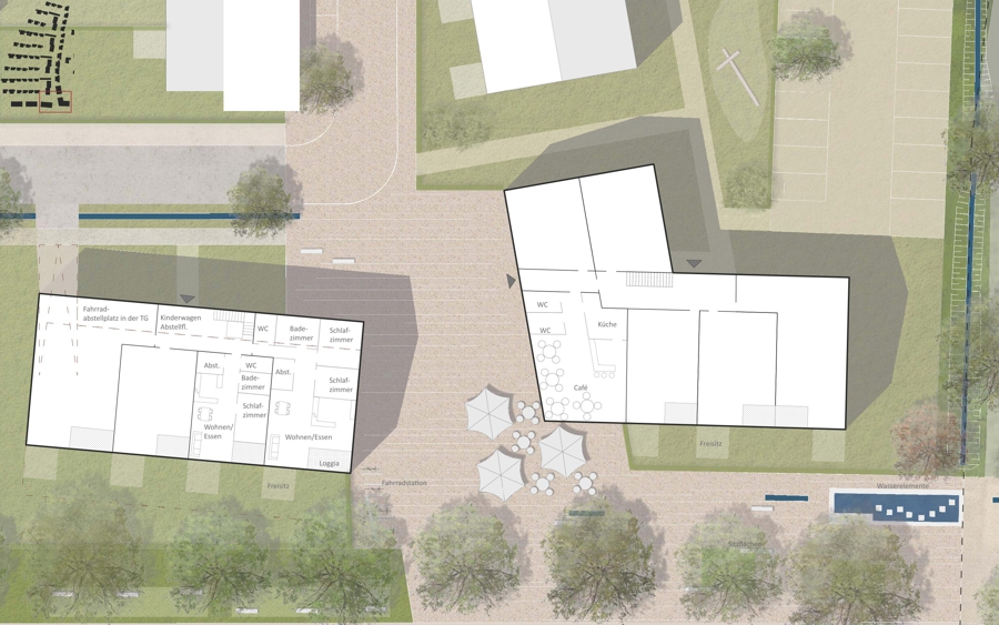 Die neuen Geschosswohnungsbauten rahmen den Dorfplatz und schaffen einen einladenden Eingang ins Neubaugebiet. Mit Erdgeschossnutzungen wie Gastronomie oder Begegnungsräumen wird der Platz belebt. Gestaltelemente wie Wasserspiele, Sitzmöglichkeiten, Baumreihen und Grünflächen verleihen dem Dorfplatz hohe Aufenthaltsqualität. Eine angrenzende Spielfläche und ein Kindergarten fördern zusätzlich die Attraktivität und schaffen einen lebendigen Treffpunkt im Herzen des neuen Baugebiets.