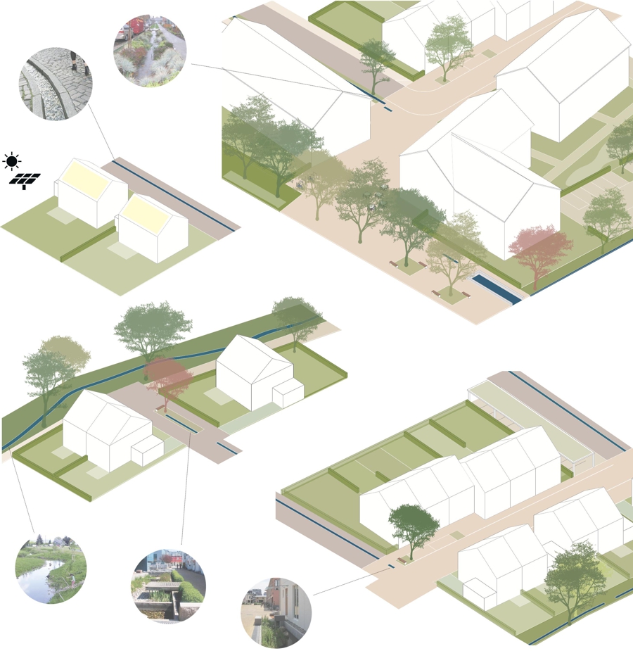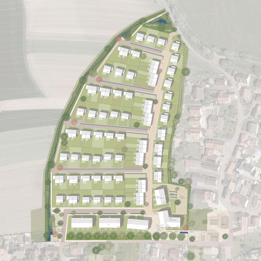 Das städtebauliche Konzept setzt auf flexible Parzellierung, die unterschiedliche Bauformen ermöglicht. Die Grundstückstiefen von ca. 25 Metern erlauben eine variable Nutzung für Einfamilienhäuser, Doppelhäuser, Reihenhäuser und Geschosswohnungsbau. Besonderer Wert wird auf ortstypische Gestaltungselemente gelegt, um den Charakter Waltersweiers widerzuspiegeln. Entwässerungsrinnen entlang der Baufelder greifen die prägenden Grabenstrukturen des Ortes auf und betonen die landschaftliche Einbindung.