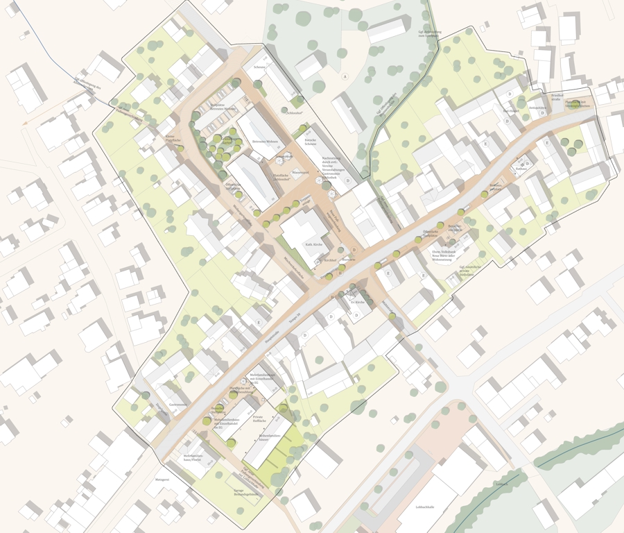 Die Vorgehensweise sieht eine umfassende Neugestaltung des öffentlichen Raums vor, insbesondere des Fellmann-Areals, auf dem sich der denkmalgeschützte Schlosshof befindet. Während einige historische Gebäude erhalten und saniert werden, wird der östliche Bereich durch den Abriss alter Scheunen und den Bau einer Wohnanlage für betreutes Wohnen mit 23 Einheiten neu strukturiert. Einheitliche Materialien und durchdachte Fußwegverbindungen sollen die Orientierung erleichtern und ein harmonisches Gesamtbild schaffen. Die öffentlichen Gebäude werden funktional und visuell miteinander verknüpft, wodurch eine klar erkennbare Ortsmitte entsteht.