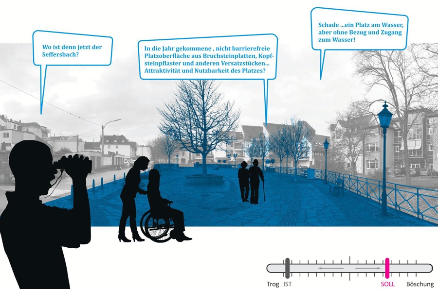 Die Arbeitsgemeinschaft MESS/BSA nahm sich intensiv der Analyse der örtlichen Gegebenheiten sowie der relevanten städtebaulichen, verkehrlichen und ökonomischen Rahmenbedingungen an. Dabei wurden verschiedene Überlegungen und Ansätze entwickelt, um eine passende Lösung für den Platz zu finden. Die zentrale Idee war, eine harmonische Verbindung zwischen der zentralen Lage des Platzes und dem angrenzenden Seffersbach herzustellen, wodurch sowohl die Aufenthaltsqualität als auch der Hochwasserschutz verbessert werden sollten.
