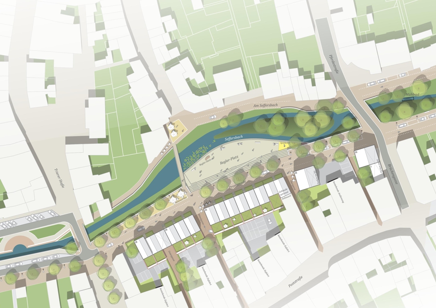 Das Ergebnis dieser Planungen ist eine Neugestaltung des Platzes, die eine großzügige Freitreppe umfasst, die den Platz direkt ans Wasser anbindet und gleichzeitig das Höhenniveau des Bachbettes aufnimmt. Diese Maßnahme verbessert nicht nur die Erlebbarkeit des Wassers, sondern sorgt auch für eine höhere Sicherheit im Hinblick auf den Hochwasserschutz.