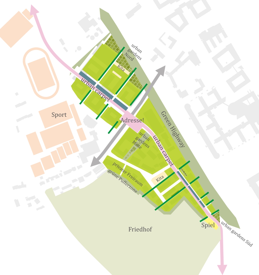 Der Entwurf eines „urban carpets“ sieht einen kontinuierlich verlaufenden Raum vor, der von Nord nach Süd ausgerollt wird und als integrativer Raum für alle Nutzer dient. Entlang dieses Bandes entstehen verschiedene Nutzungen, die das urbane Leben ausmachen, mit einer lebendigen Mitte als Kreuzungspunkt für Einkaufsmöglichkeiten und Mobilitätsangebote. Die Erdgeschosse werden mit publikumswirksamen Nutzungen belegt, und das Band ist feinmaschig mit der Umgebung verknüpft, insbesondere durch eine starke Verbindung zum Nord-Süd-Radschnellweg. Dieser Ansatz sorgt dafür, dass der urban carpet eine attraktive neue Adresse im städtebaulichen Gefüge zwischen Bundesviertel und Dottendorf wird.