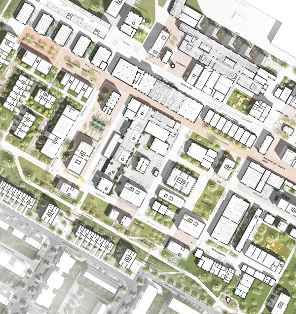 Im Rahmen eines offenen Realisierungswettbewerbs wurde MESS als Preisträger ausgewählt, um in einem weiteren städtebaulichen Wettbewerb die Entwürfe weiter zu entwickeln. Das Verfahren fand unter intensiver Beteiligung der Öffentlichkeit statt. Der Entwurf von MESS schafft ein klares und tragfähiges städtebauliches Gerüst, das durch eine Membranstruktur die Ränder des Quartiers definiert. Diese Randzonen schützen vor äußeren Störungen, wie Lärm, und bieten gleichzeitig Zugang und Vernetzung mit der Umgebung. Das innere Gerüst aus öffentlichen und privaten Freiräumen ermöglicht eine hohe Vielfalt an Nutzungen und fördert urbanes Leben.