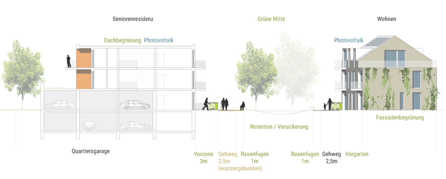 Das durchdachte Konzept erlaubt eine flexible Erweiterung des Quartiers nach Osten, indem ein Erschließungsring angefügt und die Hofstruktur gespiegelt wird. Gleichzeitig sorgen naturnahe Gestaltungselemente wie Versickerungsmulden für nachhaltiges Regenwassermanagement und eine harmonische Einbindung in die Umgebung.