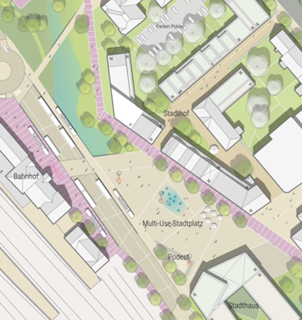 Die Planung des Forums basiert auf einer intensiven Auseinandersetzung mit verschiedenen Entwürfen und Varianten. Drei größere Gebäudemassen wurden so positioniert, dass sie sich gut in die Umgebung einfügen und den urbanen Raum aktiv gestalten. Diese Kubaturen kombinieren thematisch passende Nutzungen und schaffen lebendige Erdgeschosszonen, die Synergien zwischen den Nutzern fördern. Die Gebäudeorientierung richtet sich nach den örtlichen Gegebenheiten, insbesondere den Gleisen, dem Baumbestand und den Flutschutzanlagen. So entsteht ein urbaner Raum, der sowohl funktional als auch ästhetisch überzeugt.