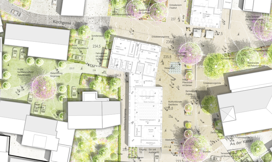 Die Verlagerung des Evangelischen Gemeindehauses in Auenstein bietet eine einzigartige Chance, eine klare und lebendige Ortsmitte zu schaffen. Aktuell fehlt Auenstein ein zentraler Ort, da sich die belebenden Nutzungen entlang der Hauptstraße aufreihen. Der Abriss mehrerer Gebäude im Bereich der Kirche eröffnet die Möglichkeit, das Kirchenumfeld aufzuwerten und eine neue Dorfmitte zu etablieren, die als Zentrum für die Gemeinde fungiert und eine hohe Aufenthaltsqualität bietet.