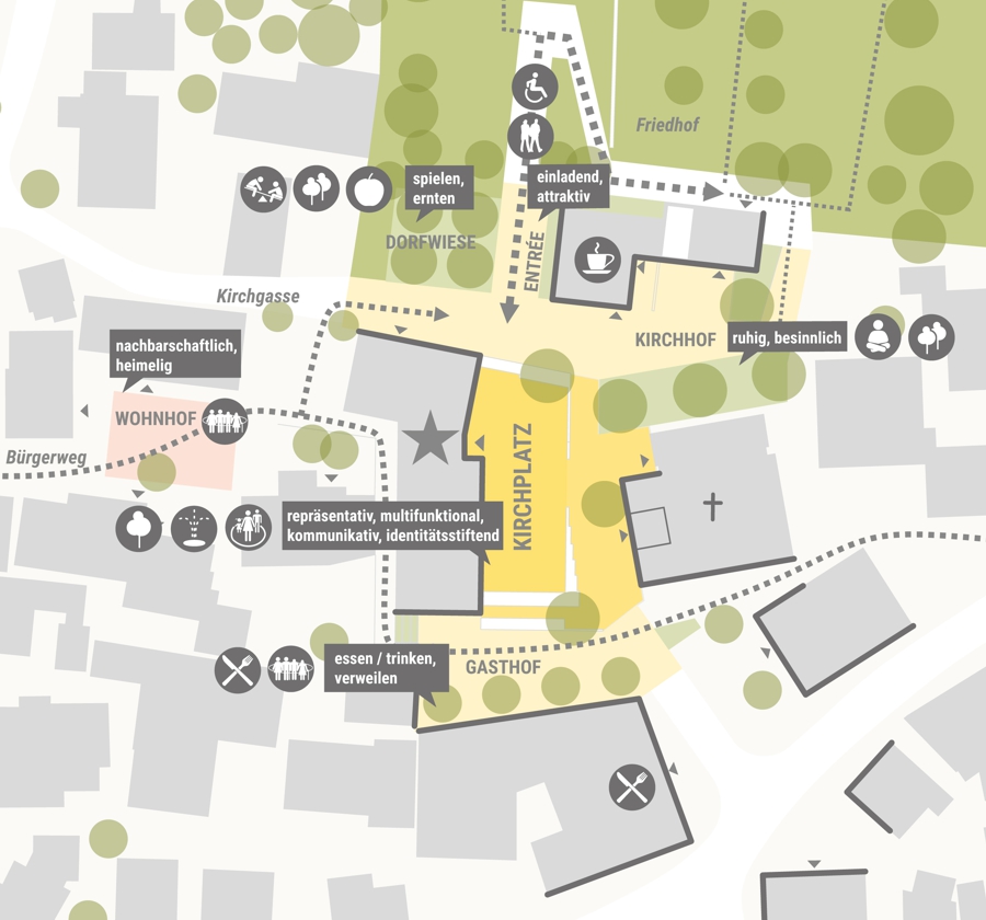 Das Ergebnis des Projekts ist eine multifunktionale und attraktive Dorfmitte, die die soziale Interaktion fördert. Das Gemeindehaus bildet eine gestalterisch wertvolle Platzkante zum Kirchplatz und verbindet diesen mit der Kirchgasse und dem Gasthof. Der Neubau eines Dorfladens und einer Wohnung trägt zur Belebung des Platzes bei. Das insgesamt entstandene Ensemble aus unterschiedlichen Platzbereichen und Gebäudeformen fügt sich harmonisch in das städtebauliche Gefüge ein und schafft einen lebendigen und einladenden Ort für die Dorfgemeinschaft.